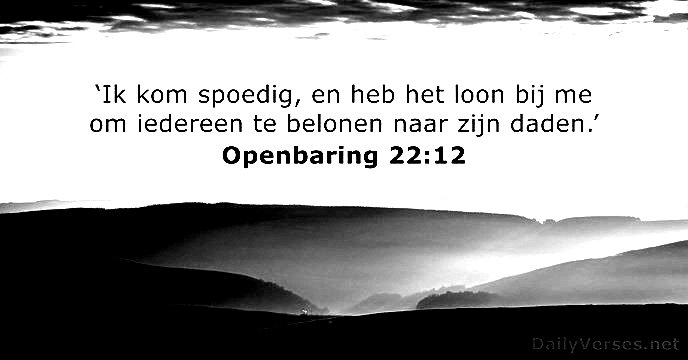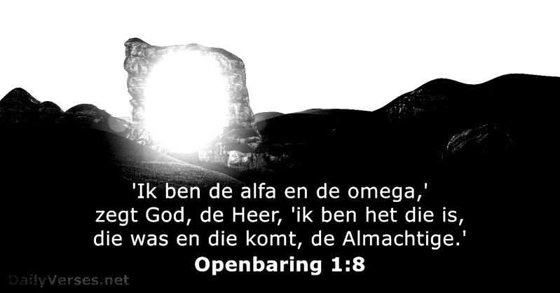 Ik sta voor de deur en Ik klop. Als iemand mijn stem hoort en de deur opent, zal Ik bij hem binnenkomen, en we zullen met elkaar aan tafel gaan. Wie overwint, zal Ik naast Mij plaatsen op mijn troon, zoals Ik zelf heb overwonnen en met mijn Vader zetel op zijn troon. -- Openbaring 3:20-21 (Willibrord)
